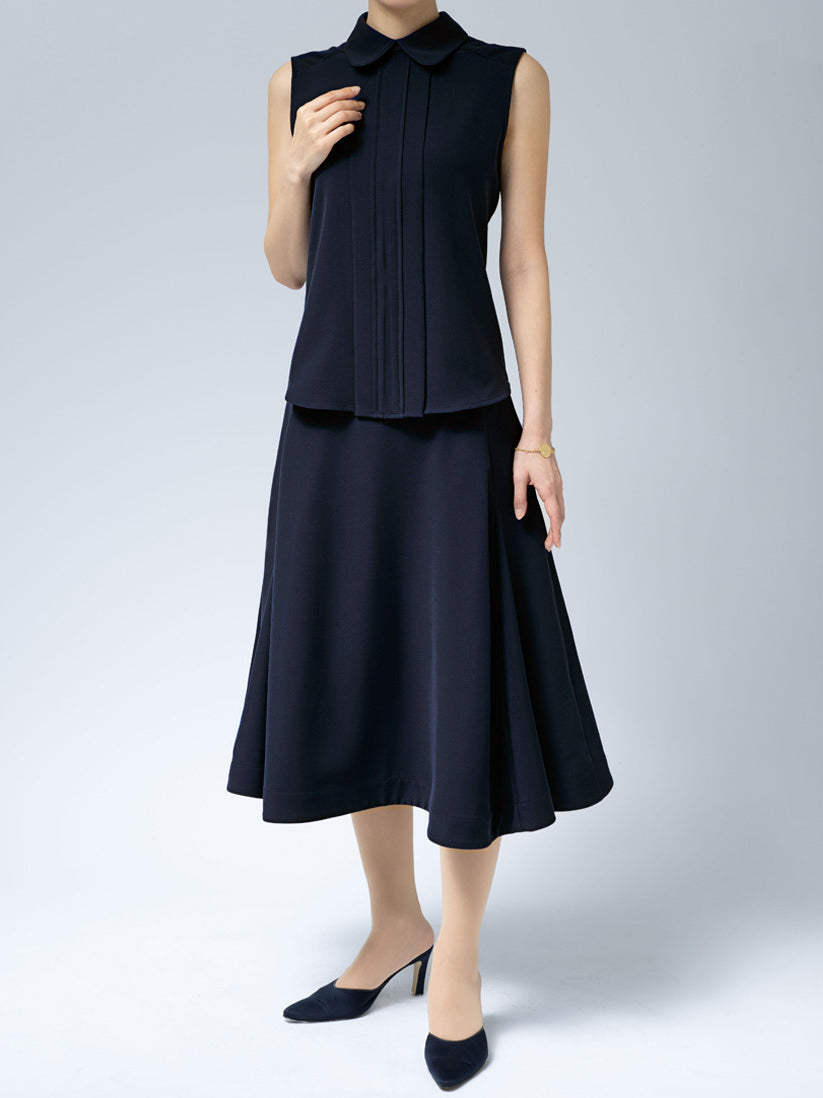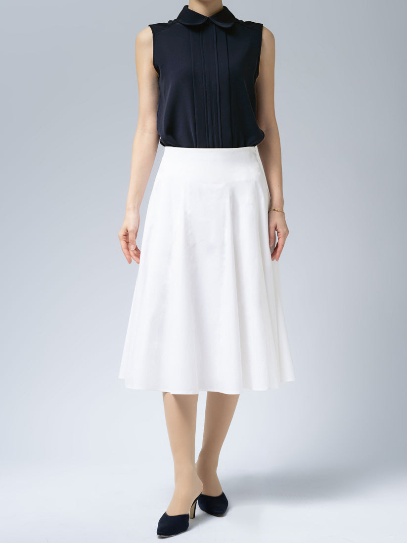 ブラウスの生地質とスカートのエアリー感が爽やかさと重厚感をダブルで演出するため、3シーズン着用できる、便利なセットアップです。